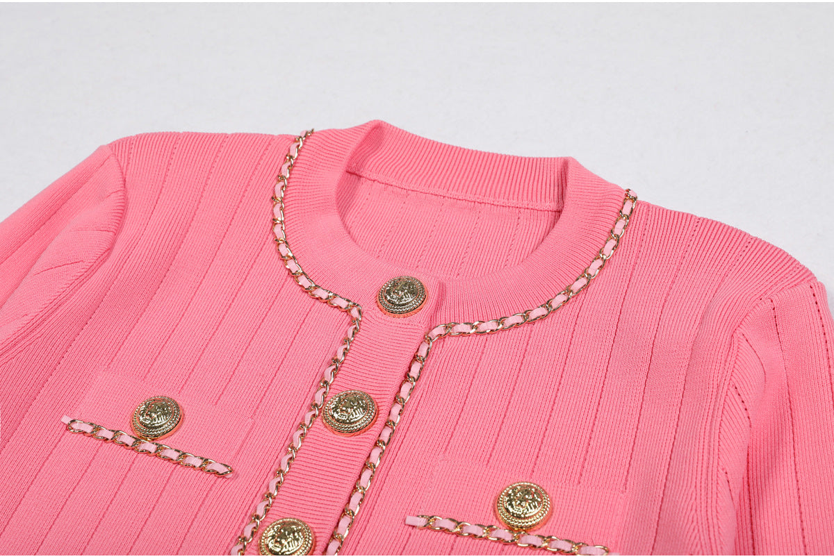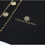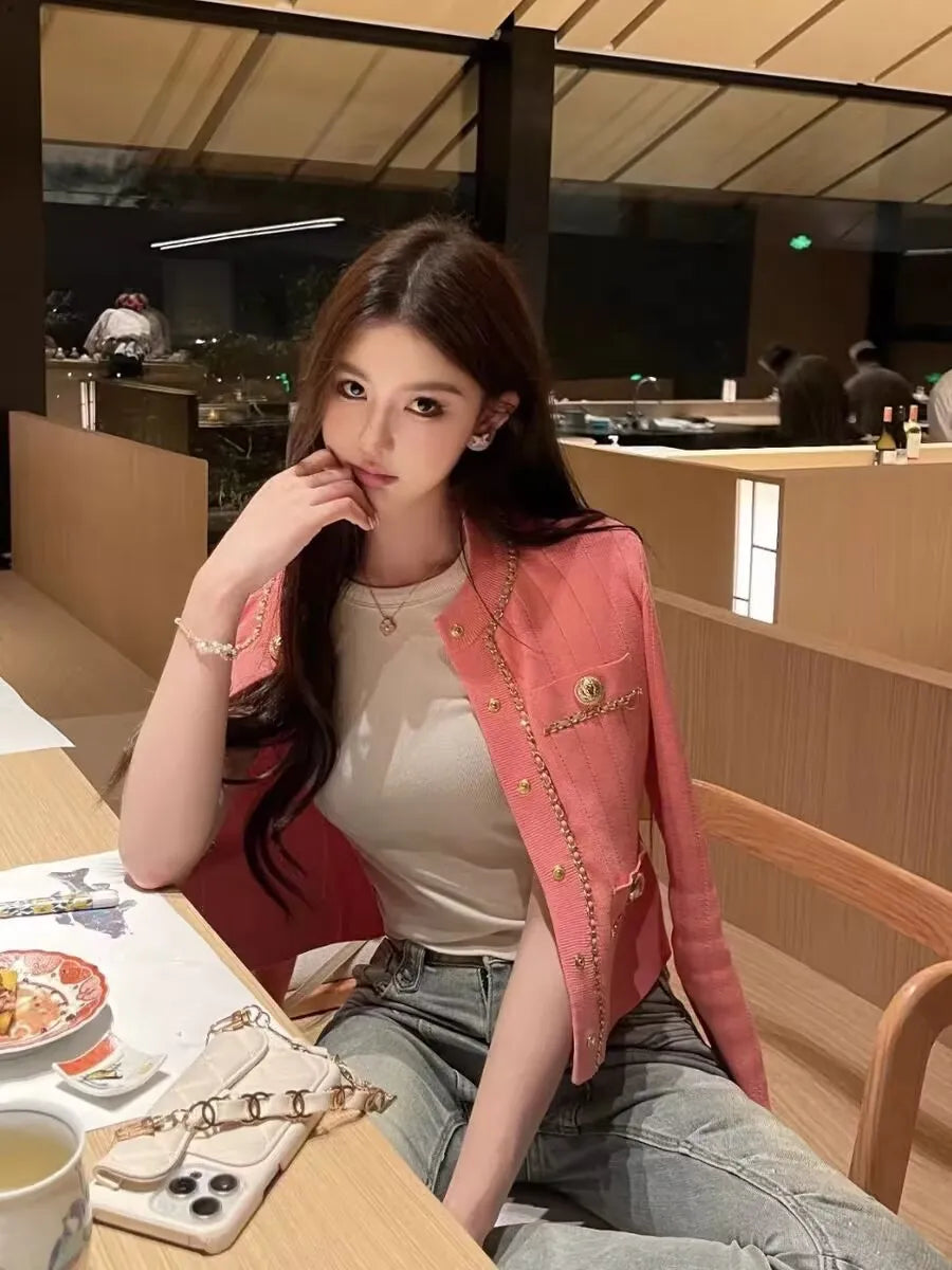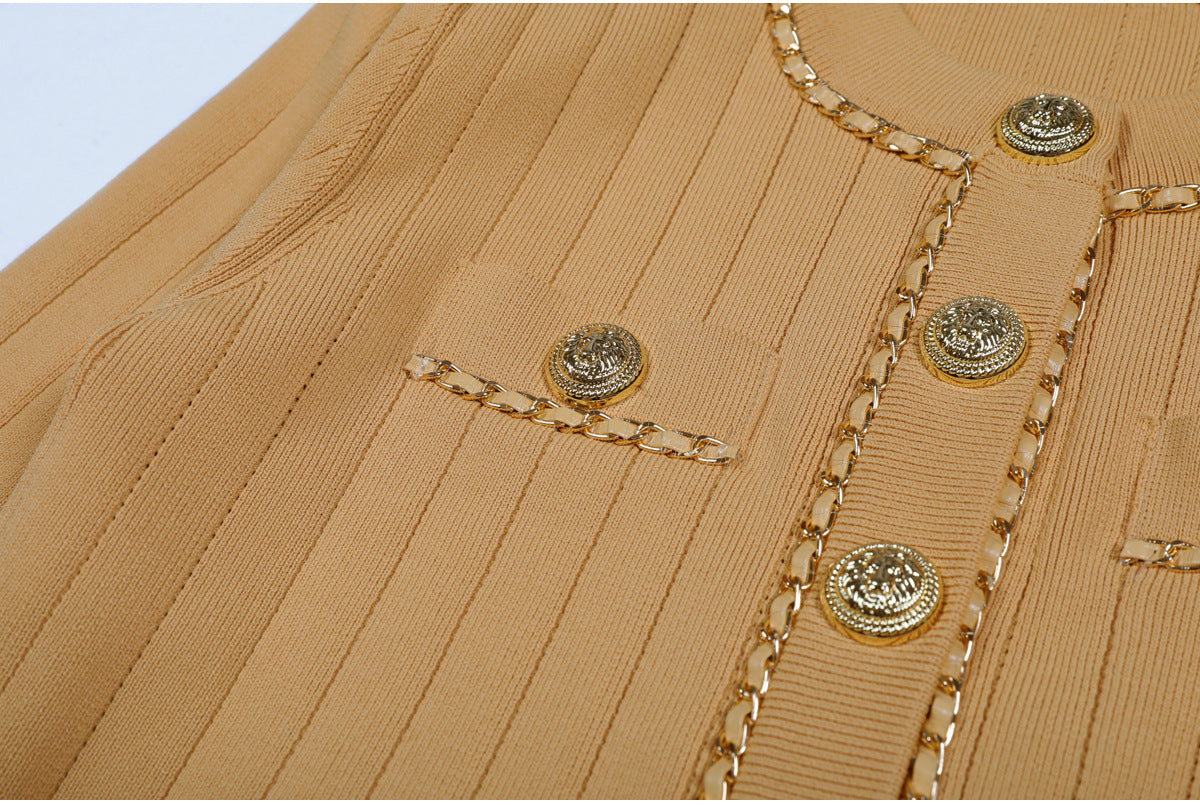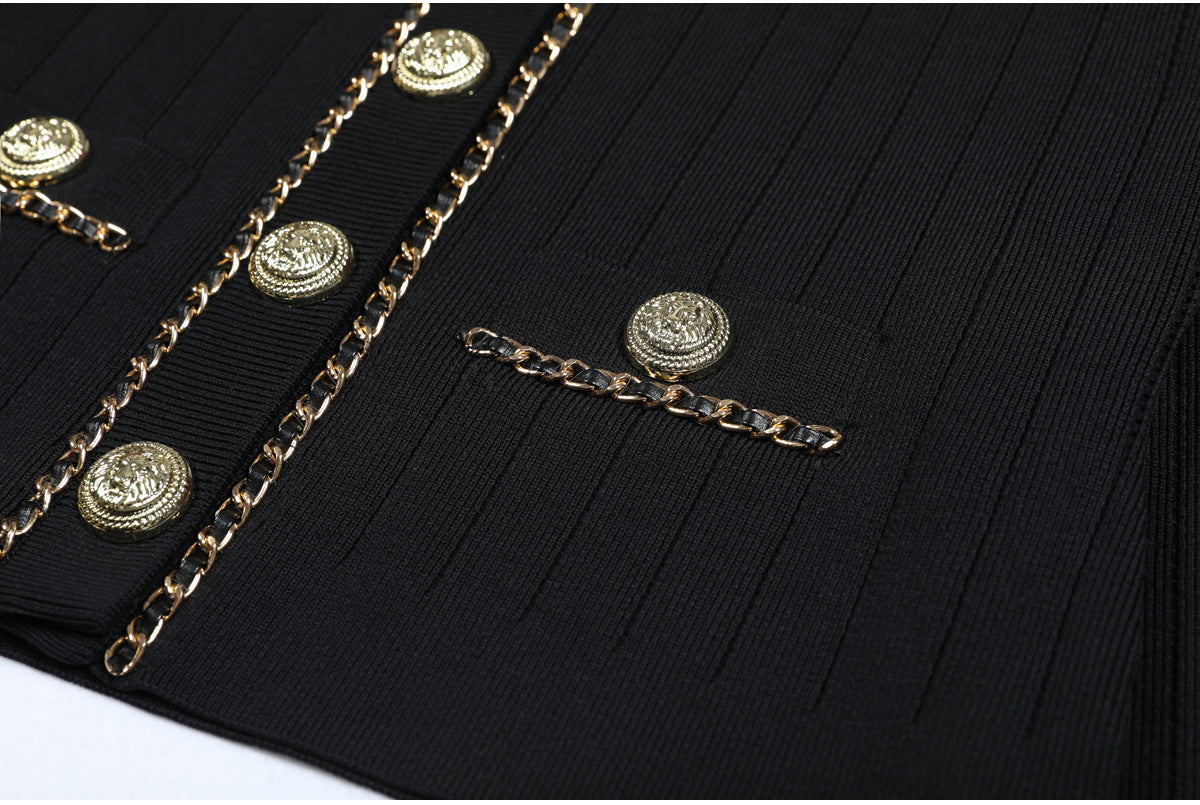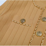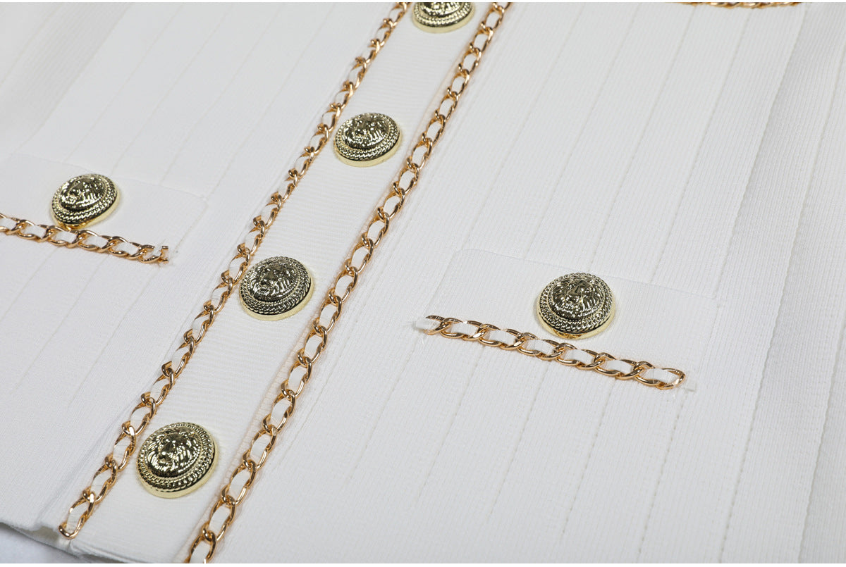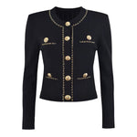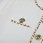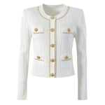 Cropped tweed jacket with gold-tone buttons and chain-trim pockets; open front, soft shoulder.