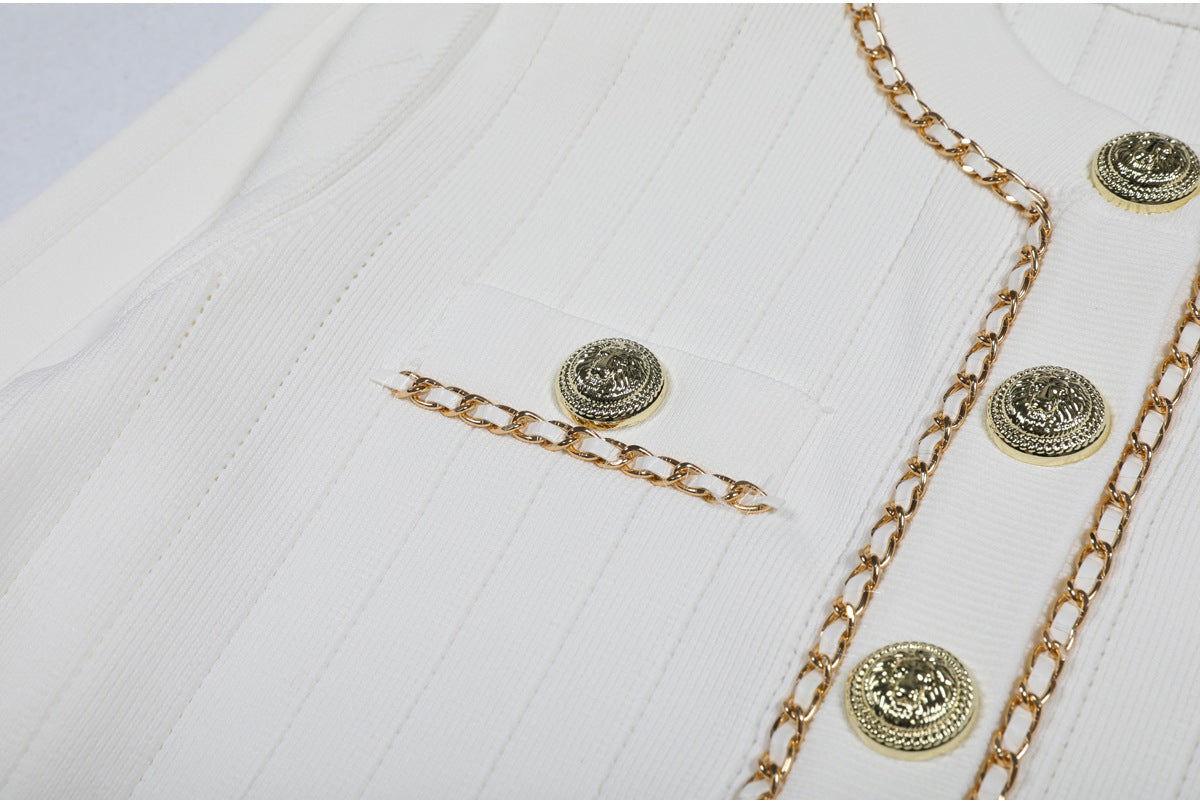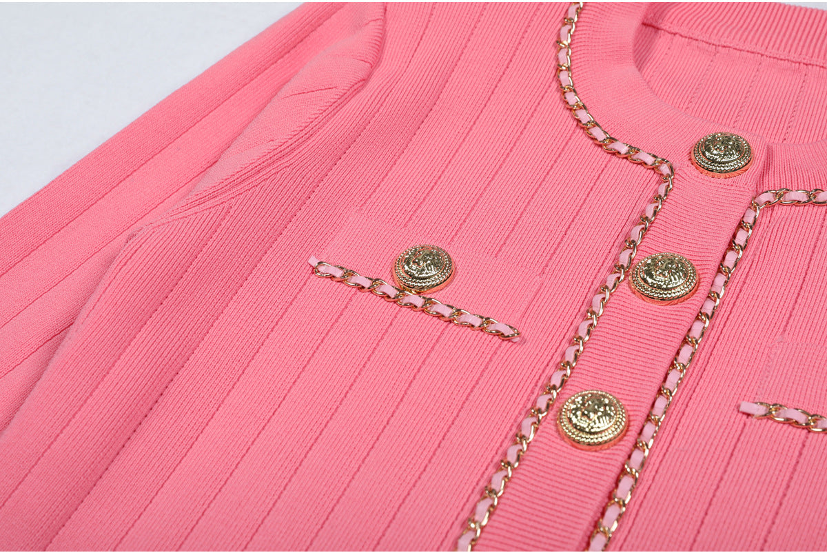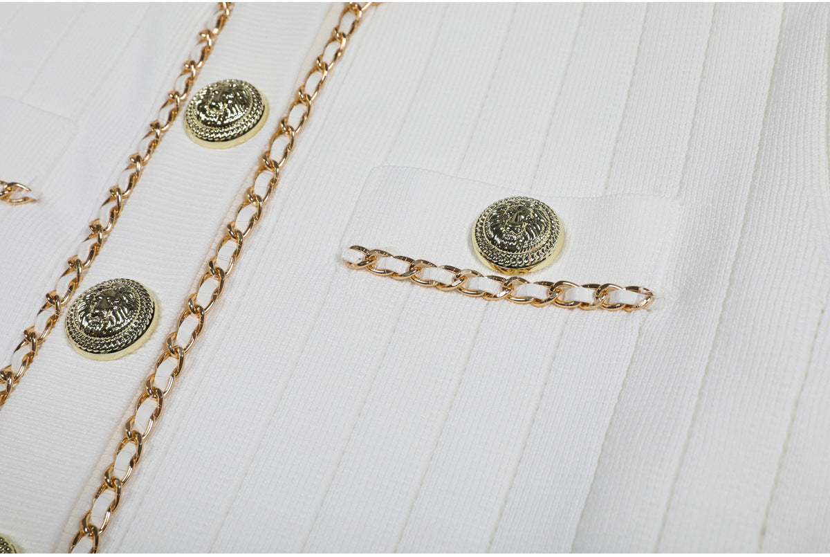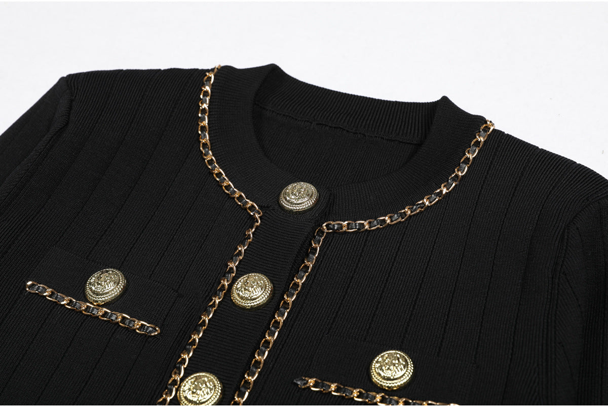 Cropped tweed jacket with gold-tone buttons and chain-trim pockets; open front, soft shoulder.