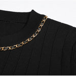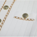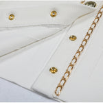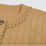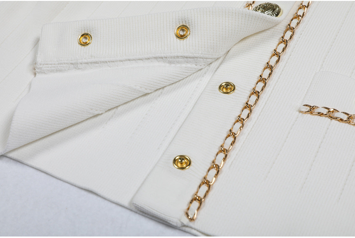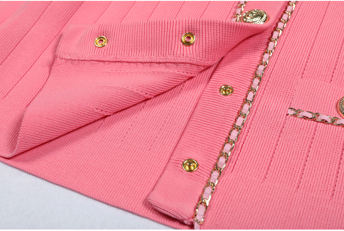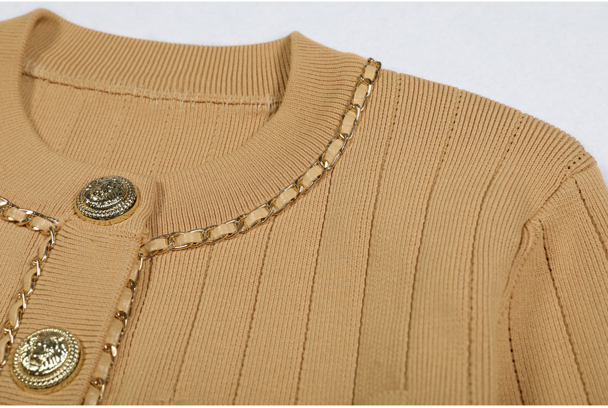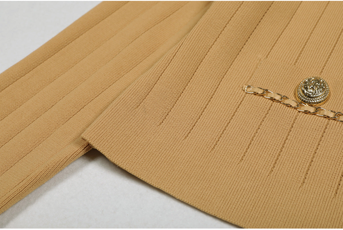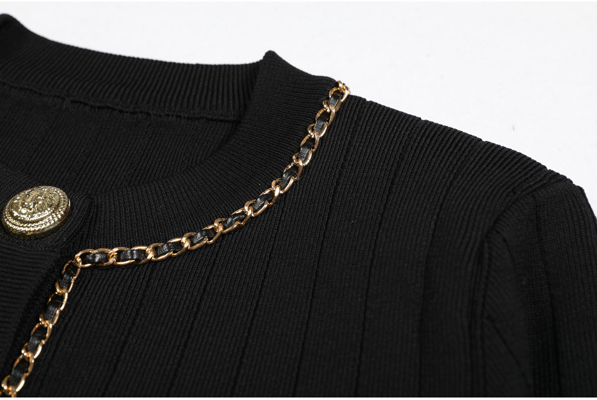 Cropped tweed jacket with gold-tone buttons and chain-trim pockets; open front, soft shoulder.