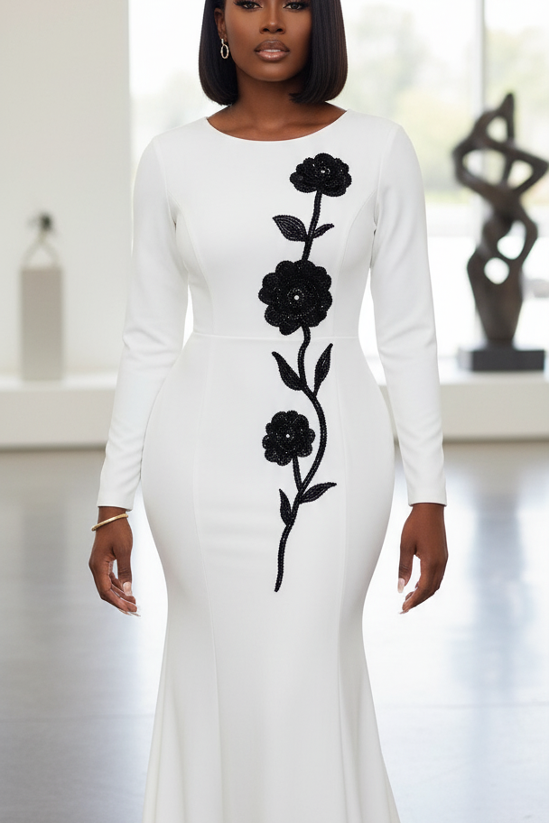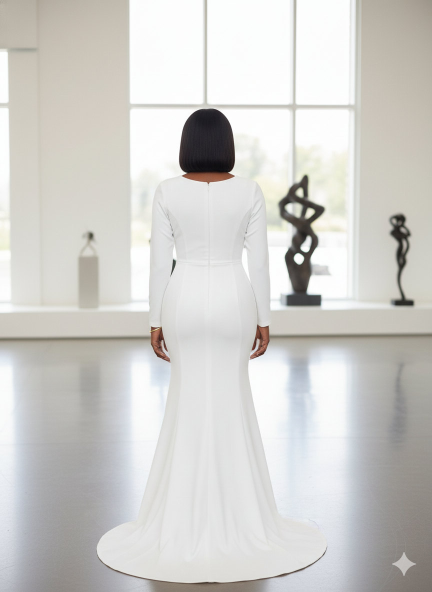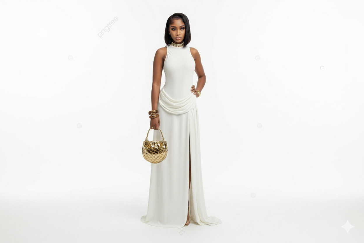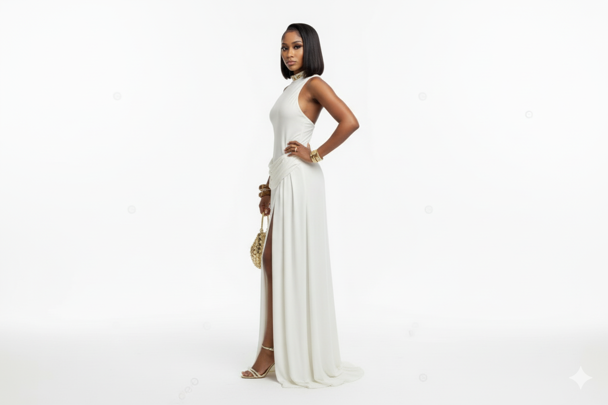 White suit jacket with gold buttons and matching pants on a hanger against a white background