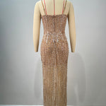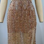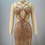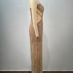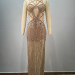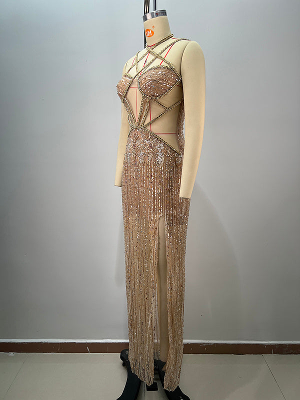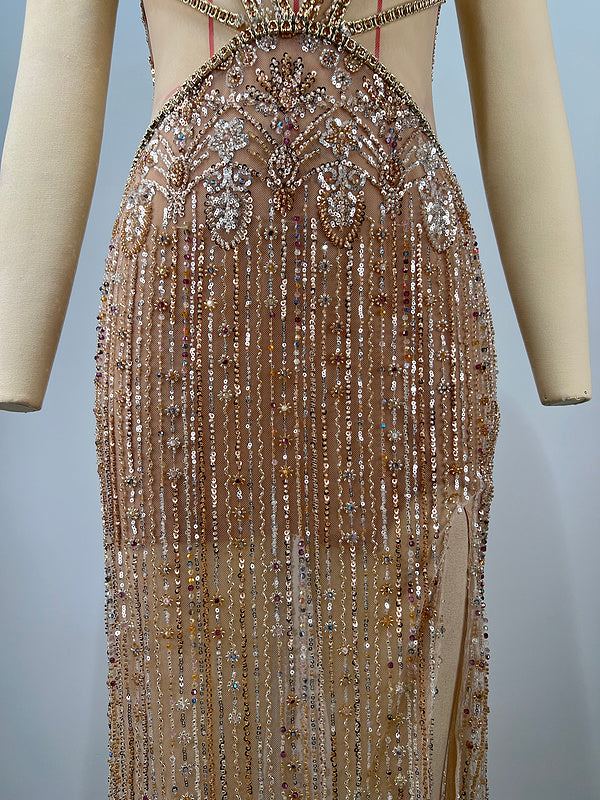 Dazzle in this shimmering champagne gown with bold front cutouts, side slit, and criss-cross neckline. Ideal for pageants or luxury evening affairs.