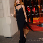 A refined, floor-length black gown with a subtle chest cutout and elegant choker detail. Crafted for upscale dinners, galas, and night events.