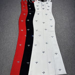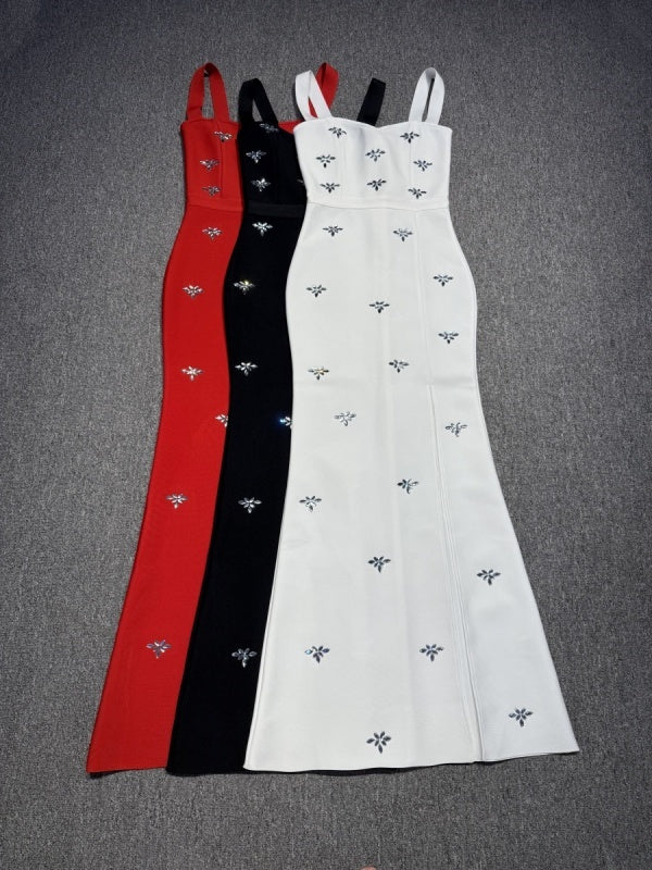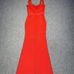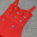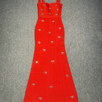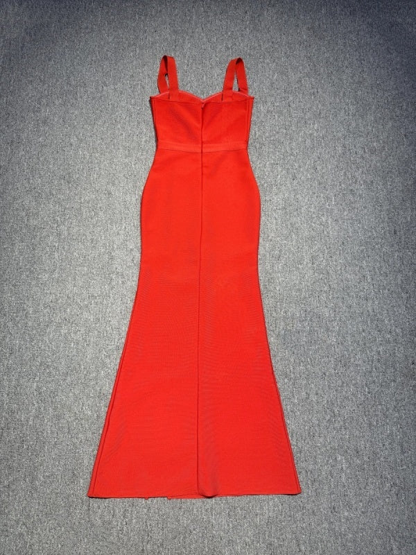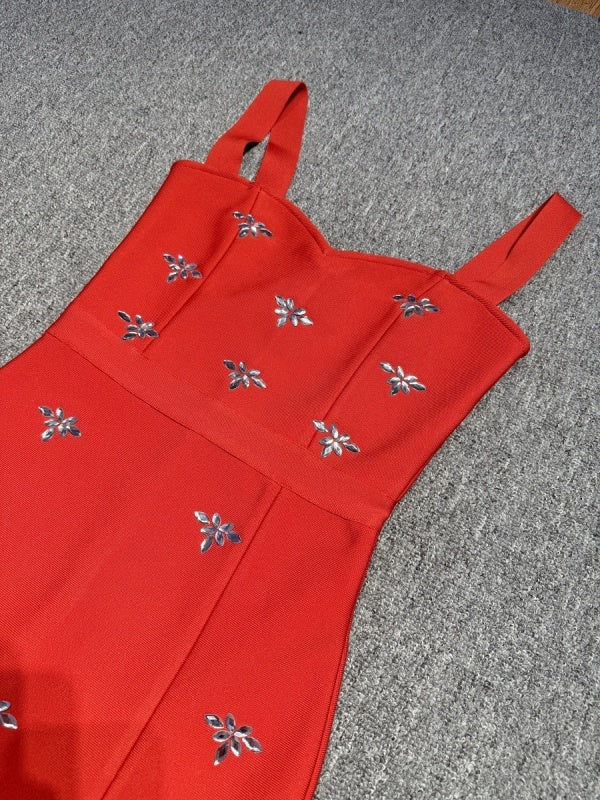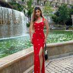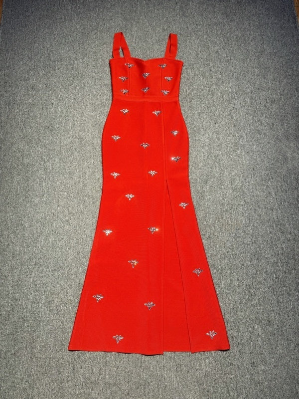 Sleek red gown with thin straps, side slit, and crystal embellishments.