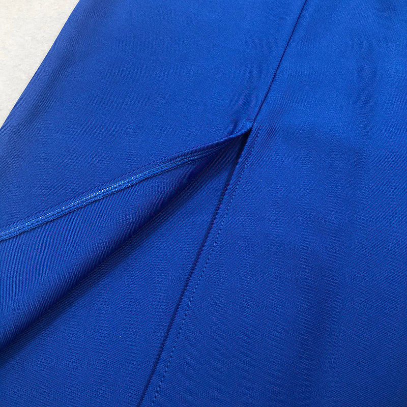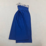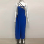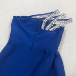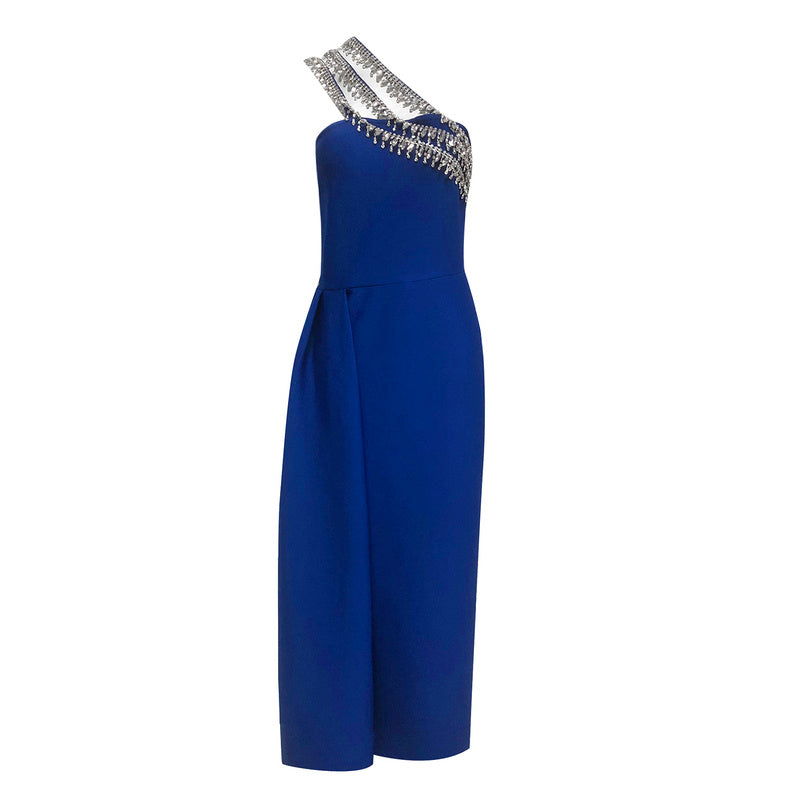 Sleek royal blue midi with asymmetrical one-shoulder neckline, crystal embellishment along the strap and bust, and a flattering A-line skirt.