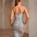 Chic mini dress in shimmering silver with a fitted bodice and sweetheart neckline.