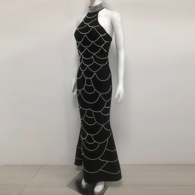 Black Crystal Embellished Halter Gown