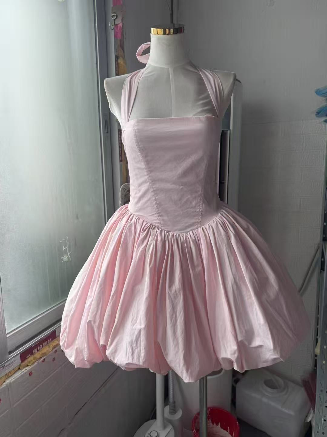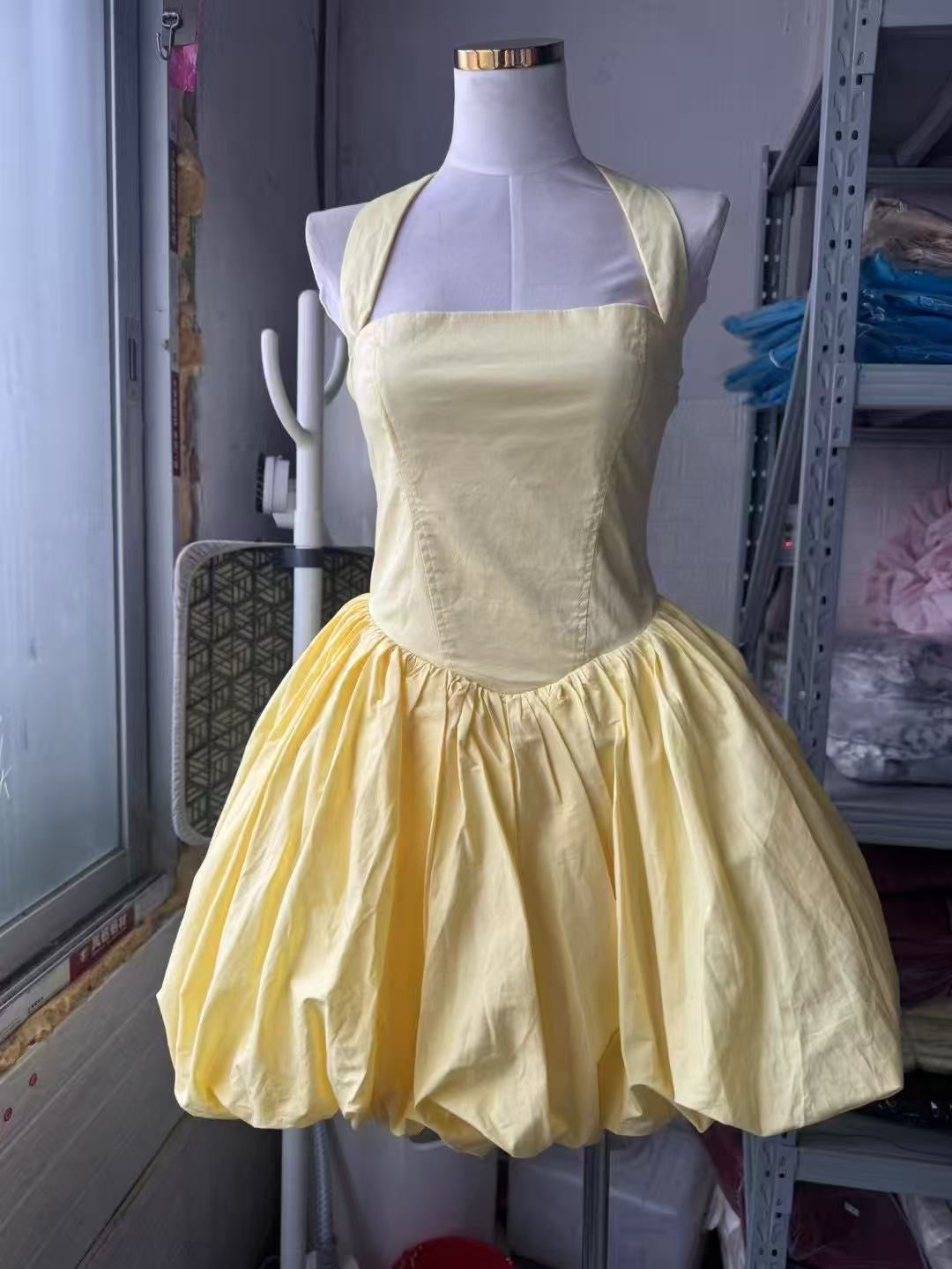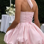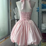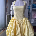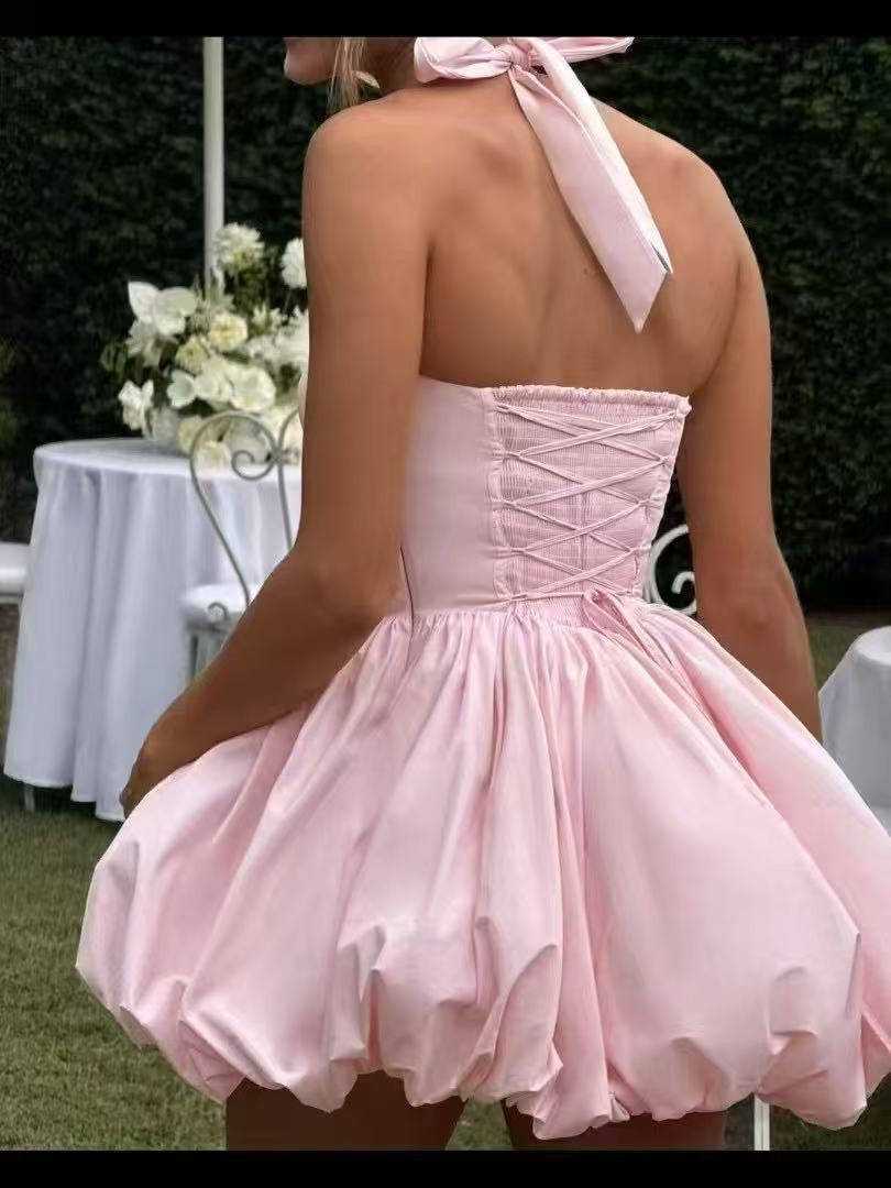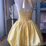 Playful halter mini dress featuring a structured bodice and voluminous bubble skirt. Perfect for parties, dates, or stylish brunches.