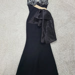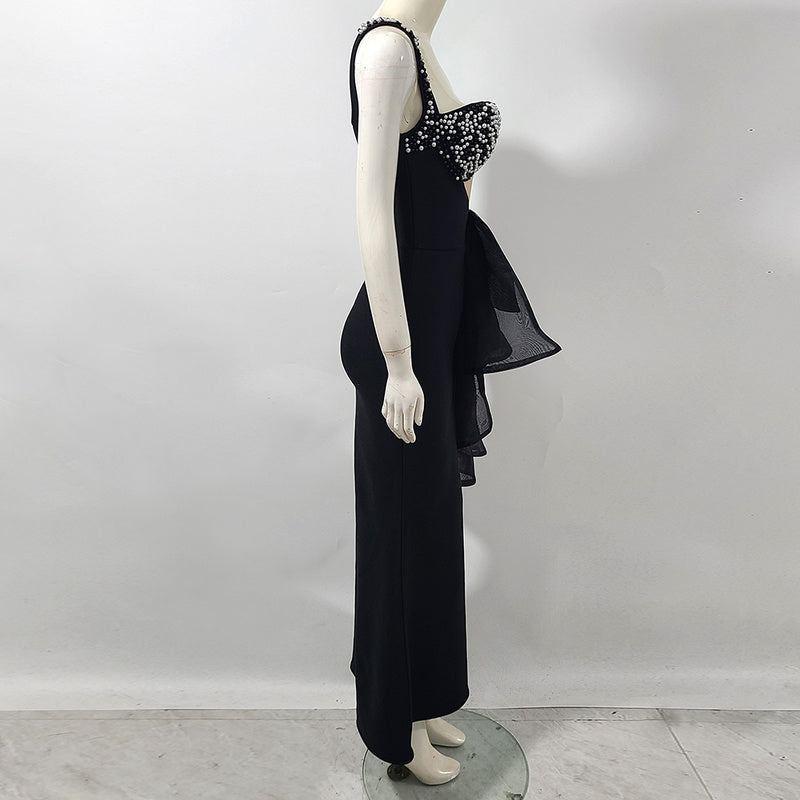 Command the spotlight in the Noir Royale, a statement evening gown for the woman who defines elegance. Featuring a crystal-studded square neckline, figure-contouring satin fabric, and a sweeping side bow, this one-shoulder design merges modern glamour with timeless appeal. Perfect for red carpet events, galas, or black-tie soirées.