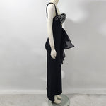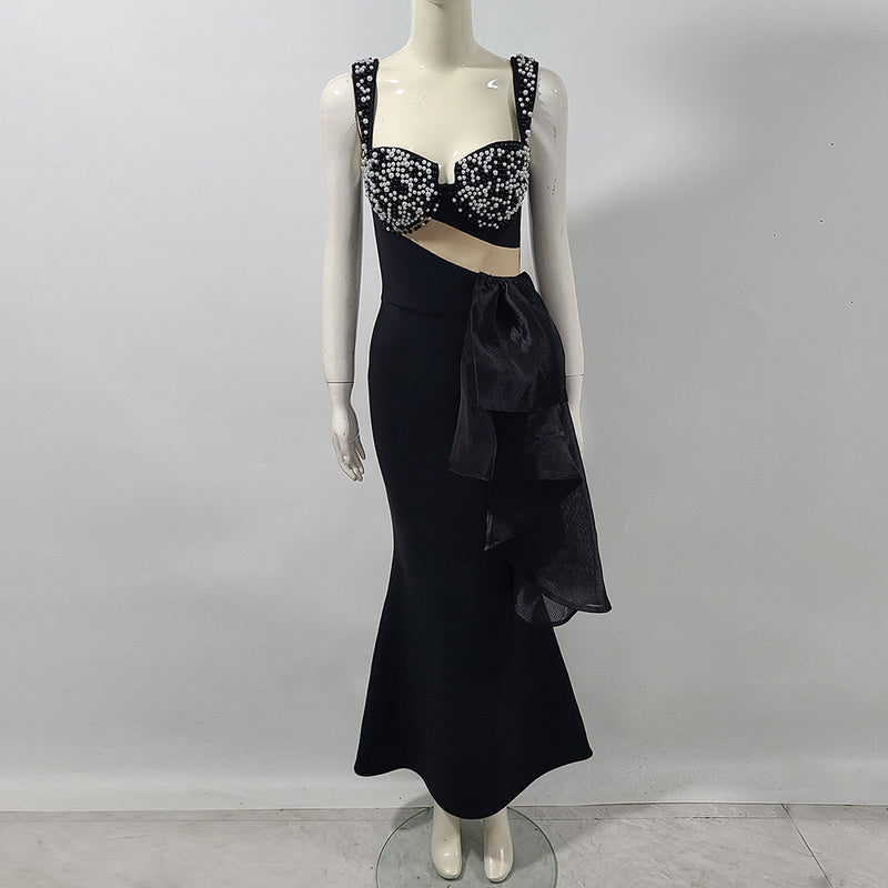 Black crystal-embellished evening gown with square neckline, side bow, and mermaid fit – worn by model in studio – EtiquetteMode formal collection