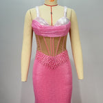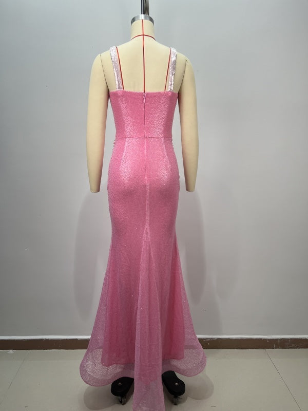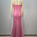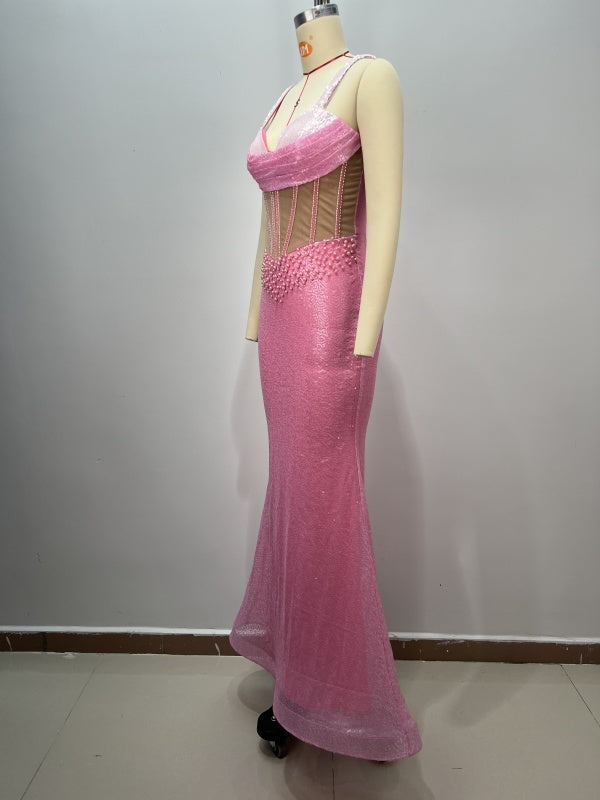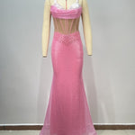 Elegant pink gown embellished with crystals, structured bodice, and mermaid silhouette.