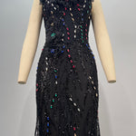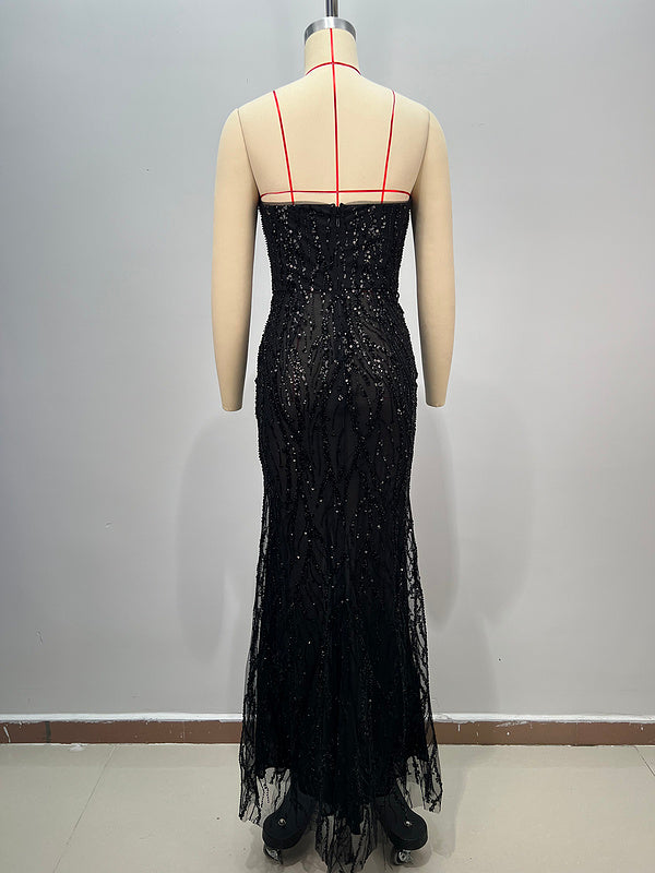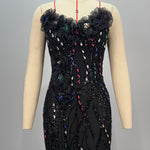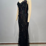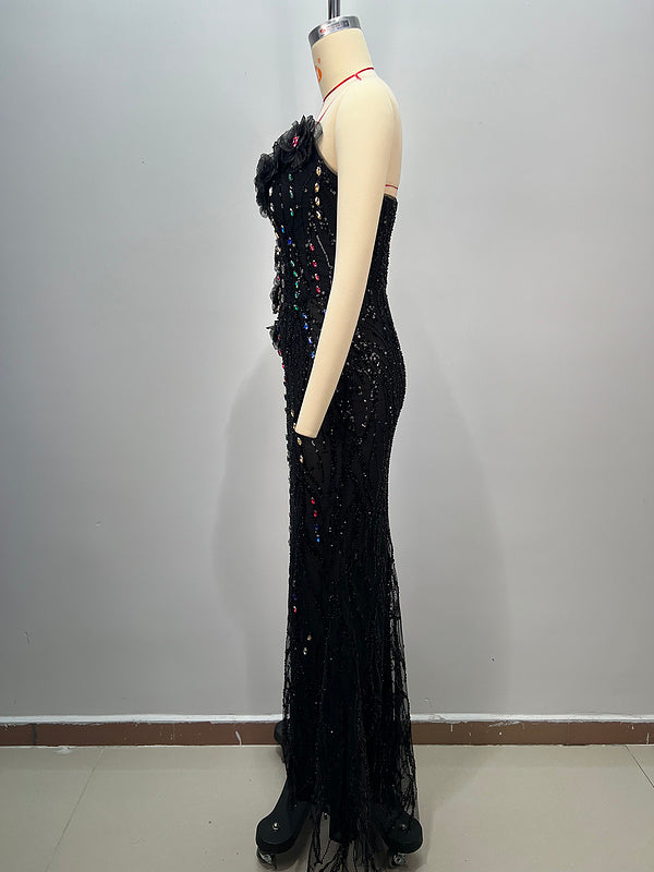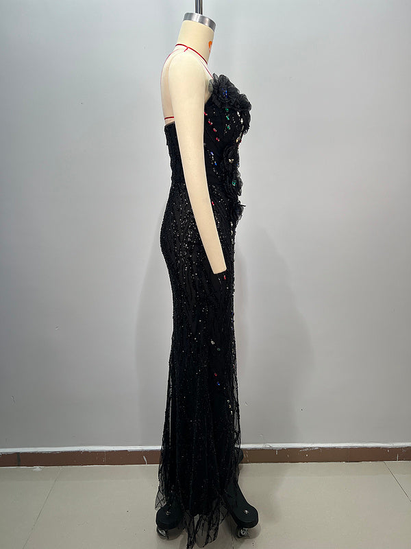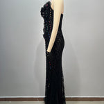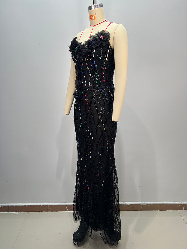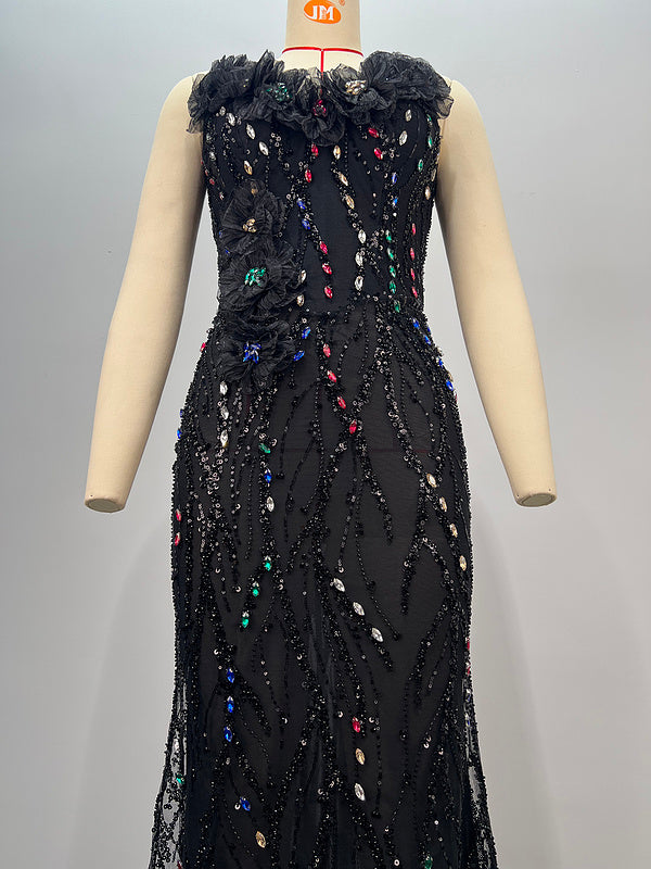A luxurious black gown adorned with multicolor sequins and floral embellishments. Designed for red carpet events or exclusive evening galas.
