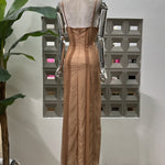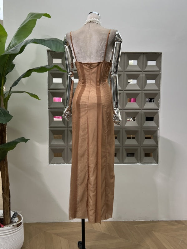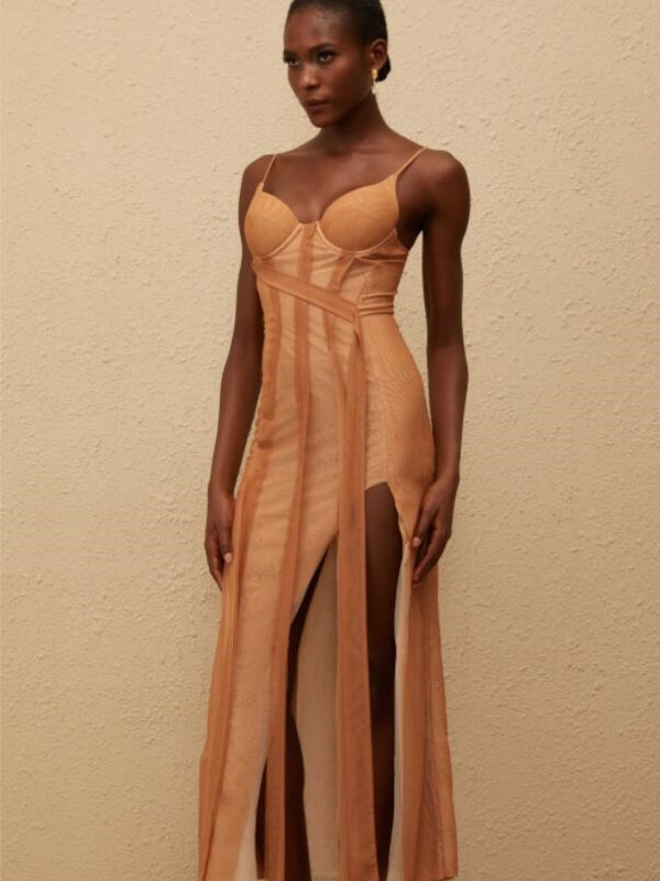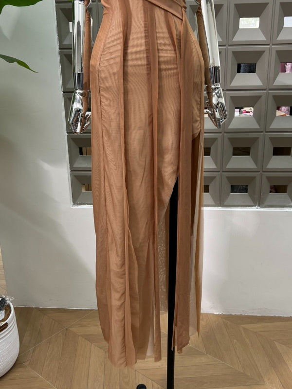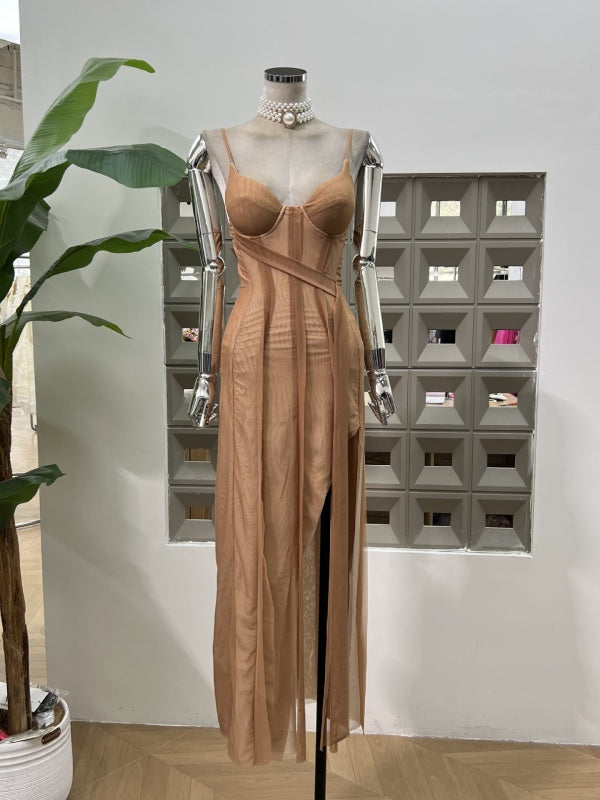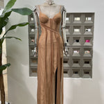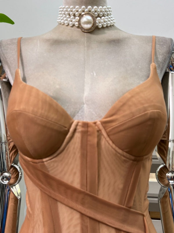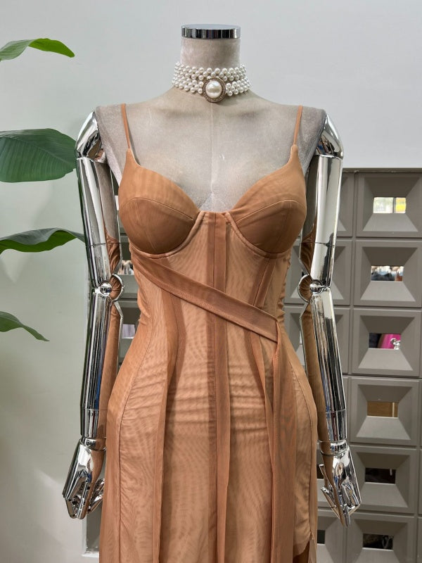 Sensual nude gown with sheer paneling, fitted bodice, and thigh-high slit.