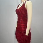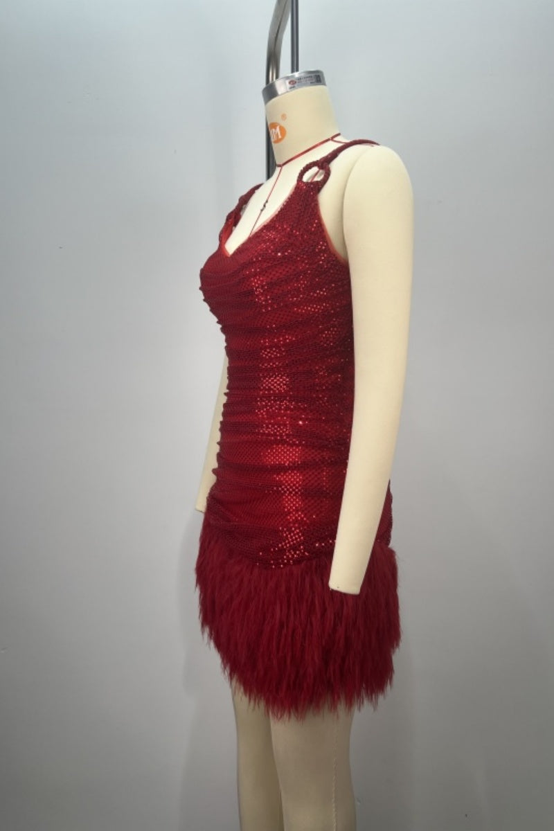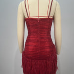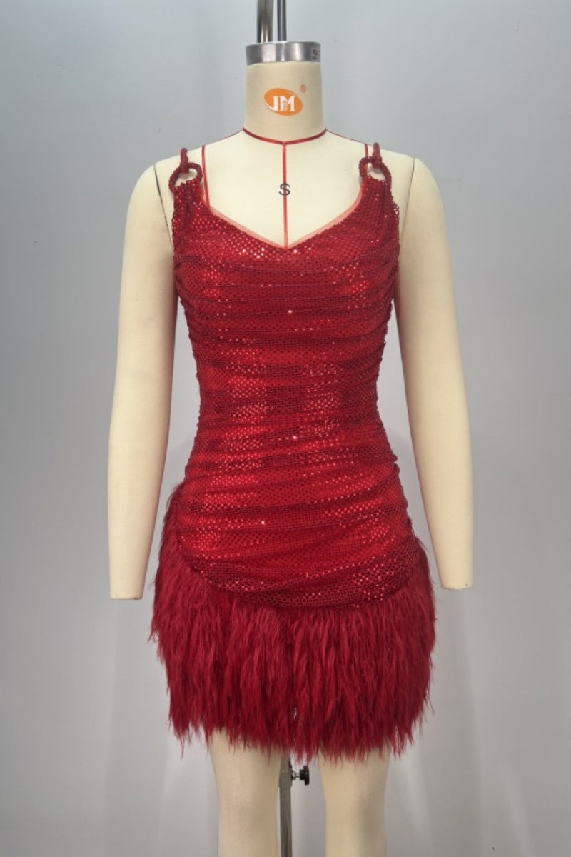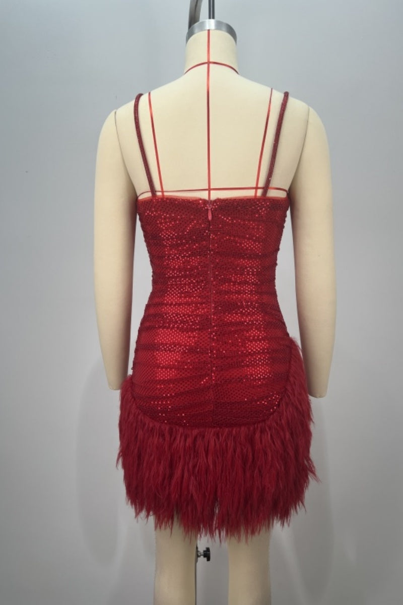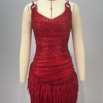 Glamorous red mini dress with shimmer fabric and feather-trimmed hemline.
